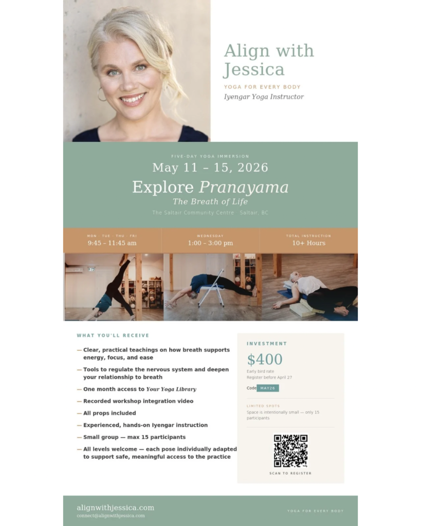 May 11–15, 2026 · Saltair Community Centre · The Breath of Life. Practical knowledge of how breath supports energy, focus, and ease with experienced Iyengar…