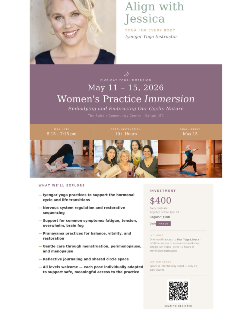 May 11–15, 2026 · Saltair Community Centre · Embodying and Embracing Our Cyclic Nature. Iyengar yoga practices to support the hormonal cycle, nervous system regulation,…